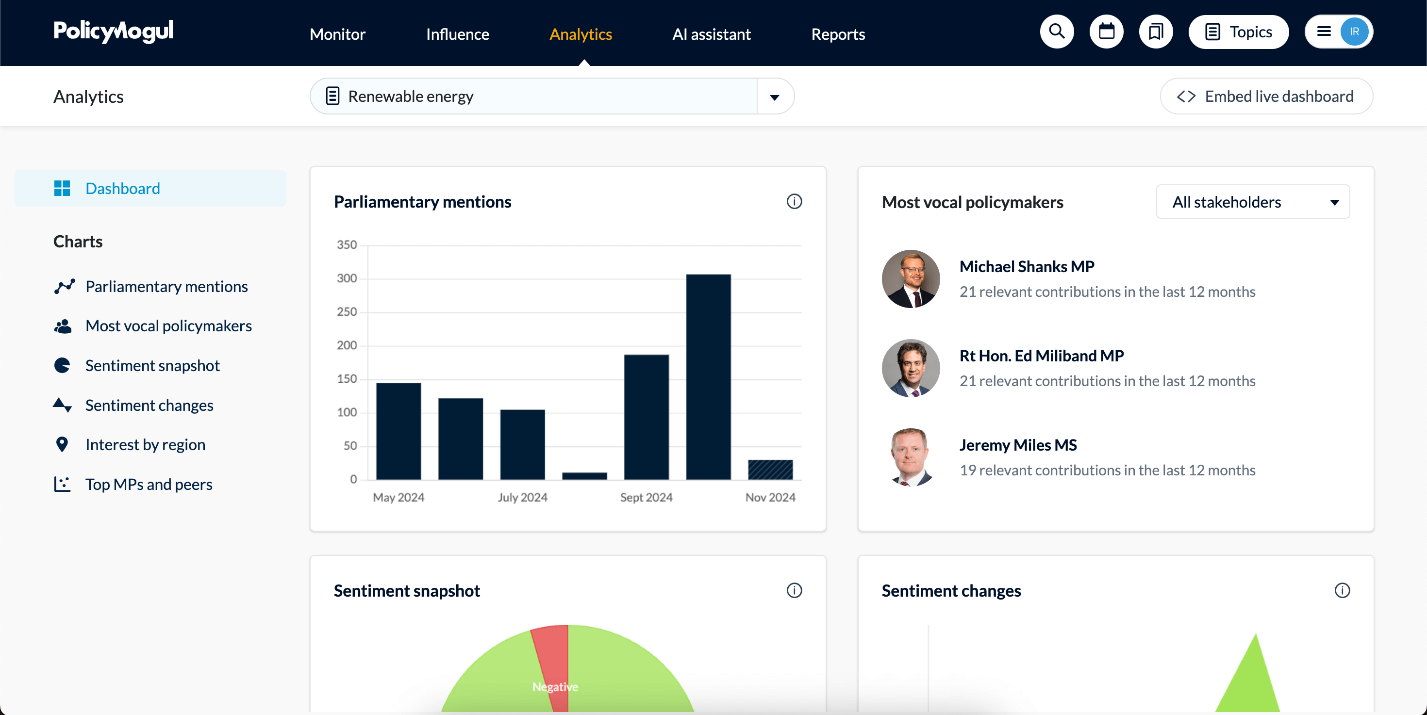 PolicyMogul’s analytics platform provides real-time data from across the political landscape in relation to any issue. It includes dashboards and charts showing trends, such as the number of parliamentary contributions, sentiment amongst policymakers, interest by region, and more.