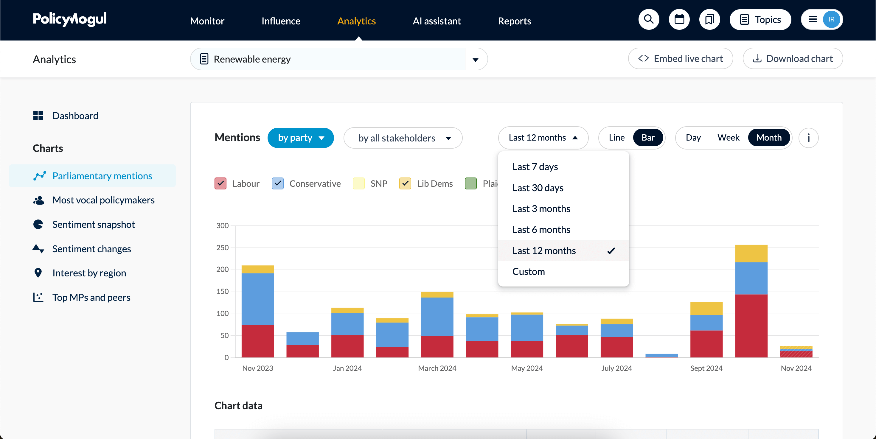 Our analytics tools allow you to customise charts, including selecting the data you want to visualise, adjusting timeframes and applying filters for different policy areas or stakeholders. This level of customisation ensures the insights you get are specific to your interests and engagement needs.