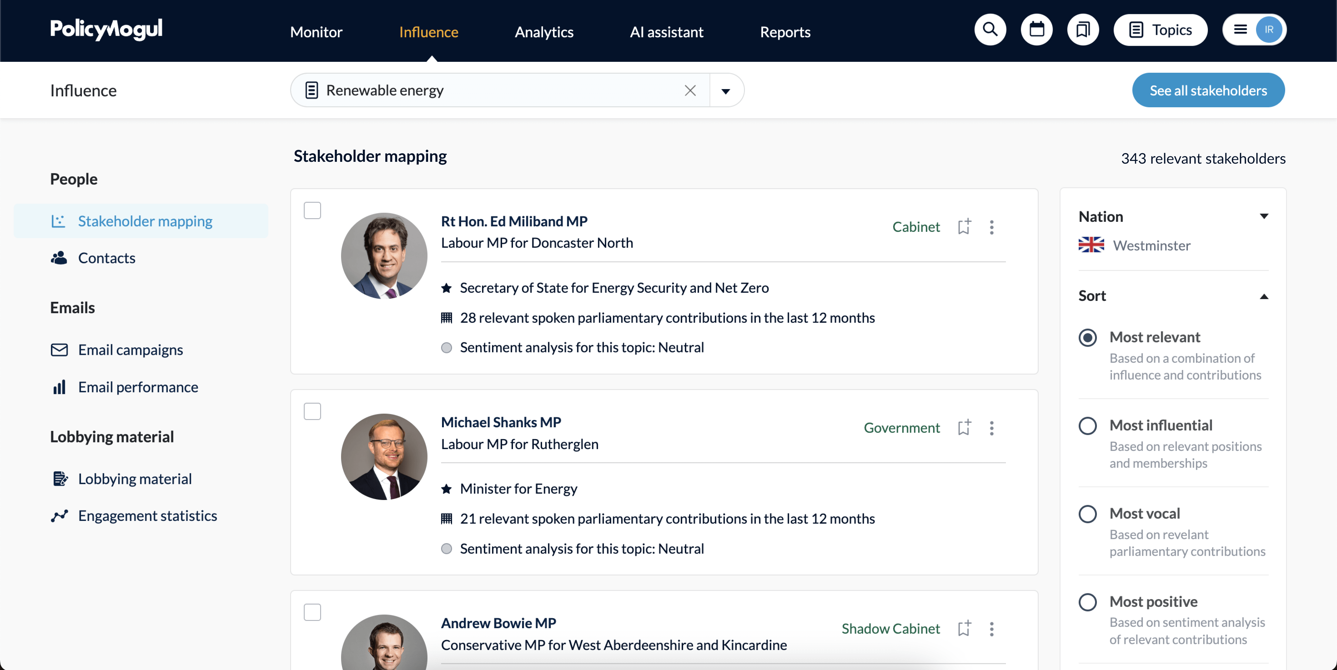 PolicyMogul’s stakeholder mapping service allows you to identify political stakeholders most relevant to each of  your organization’s interests. You can order stakeholders based on their relevance, their influence or their interest in a given issue, as well as which are speaking most positively and most negatively in relation to that issue.